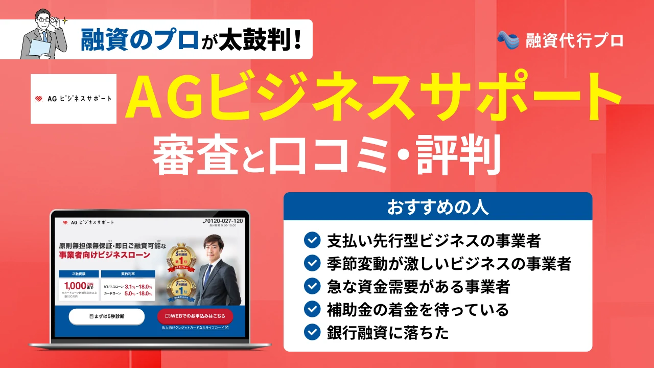 ノンバンク系ビジネスローンの特徴は、なんと言っても審査の柔軟さ(優しさ)と、圧倒的な審査スピードの速さです。筆者がおすすめしているビジネスローンだと「AGビジネスサポート」などがノンバンク系ビジネスローンに該当します。