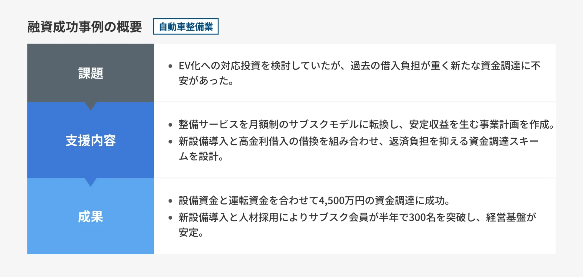 - 自動車整備工場を営む経営者が総額4,500万円の調達に成功
