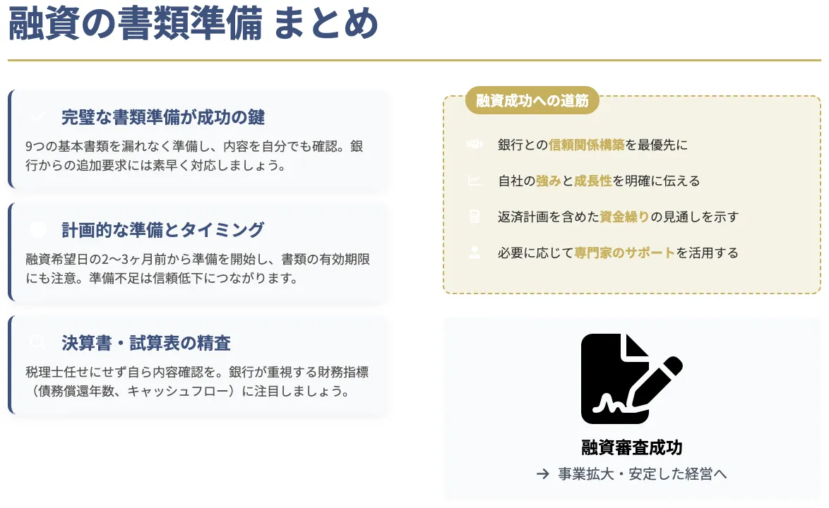 以下は本記事のまとめの図解です。必要書類についてわからなくなったら、都度、本記事を見直して融資を成功させましょう!