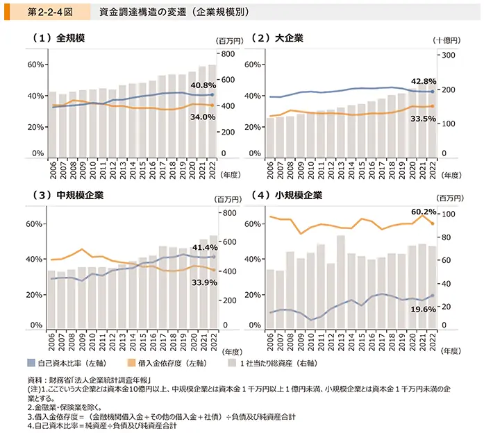 多くの中小企業では、資金不足を賄うために借入金を活用していますが、それによって自己資本比率はさらに低下しています。実際、小規模企業における借入金の依存度は60.2%と高い傾向です。
