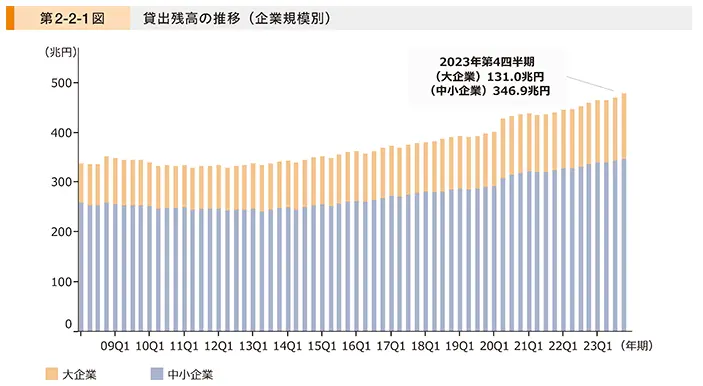 中小企業庁の「2024年版 中小企業白書」では、中小企業に対する金融機関の貸出残高が、過去最高の約346.9兆円に達していることが明らかとなりました。